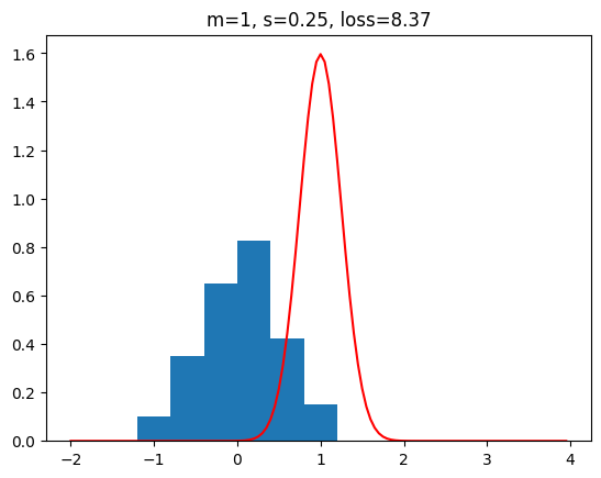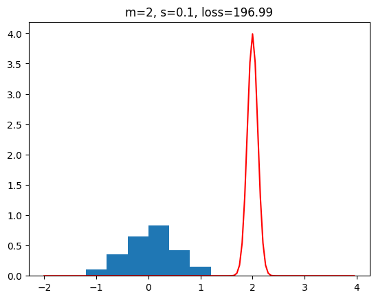 직관적으로 \(E\)의 성질에 대해 알아보자. 데이터가 있는 곳에서 모두 확률이 0이되도록 파라미터\(\theta\)를 조정하여 확률 밀도를 추측했다고 하자. 그러면 각 덧셈항 안의 로그함수에 0이 들어가기 때문에 음의 무한대로 발산하게 되고 전체항에 음수가 붙기 때문에 양의 무한대로 발산하는 꼴이 된다. 따라서 데이터가 있는 곳에 확률이 있어야 오류가 적어질 것이다. 데이터가 적은 \(\textbf{x}\)점에 더 확률을 크게 설정하고 데이터가 큰 \(\textbf{x}\)점에 확률을 적게 설정하면 반대 경우보다 \(E\)가 크다는 것을 금방 알 수 있다. 그런 비교를 계속 진행해서 최소인 것을 찾을 수 있다. 만약 발산하는 함수(dirac delta function)을 추측 확률 밀도 함수로 이용하면 음의 무한대로 발산하기 때문에 최소가 없게 된다. 이런 특이한 함수를 쓰는것이 아닌이상 최소는 존재한다. 이런 가정 아래에서 오류함수를 최소화하는 파라미터 \(\textbf{x}\)를 찾아볼 수 있다. 이런 과정의 예시를 아래 그림에서 확인할 수 있다.