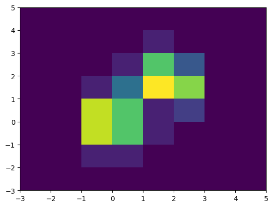히스토그램 방법의 문제는 구간을 너무 작게 잡으면 구간당 빈도수가 적어지면서 신뢰도 문제가 다시 발생하는 것이다. 데이터 부족문제의 핵심은 구간(bin)에 담겨져 있는 데이터 수가 적을 때 신뢰도가 낮아진다는 것이다. 따라서 데이터가 많아도 구간을 너무 잘게 쪼개면 신뢰할 수 없는 밀도를 얻게 된다. 또한, 너무 듬성하게 구간을 쪼개도 전체 분포의 특성을 알 수 없다. 예를 들어, 마트 시식 코너가 있는 지하 1층에서 사람들의 위치 정보를 모두 얻었다고 하자. 그리고 인기 있는 두 시식 코너가 3m 쯤 떨어져있다고 하자. 사람들 위치는 2차원 평면 위에 있기 때문에 x,y 두 확률 변수로 나타낼 수 있다. 다양한 사람들이 자신들이 필요한 물건을 구매하기 위해 제각각 떨어져 있겠지만 인기있는 두 시식 코너에 몰려 있다. 이 때 5m x 5m단위로 구획을 나누어서 사람들이 얼마나 있는지 분석해본다고 하자. 두 시식코너가 3m떨어져 있기 때문에 이런 크기의 구획으로는 인기있는 장소가 한곳으로 추측될 것이다. 그러나 2m x 2m로 구획을 나눠서 각 구획에 사람이 얼마나 있는지 세어보면 확실히 3m떨어진 두 시식코너가 인기 있다는 것이 잘 드러날 것이다.(아래 그림 참조) 이렇듯 히스토그램을 만드는데 있어서 데이터가 갖는 성질을 잘 드러내는지 아닌지는 구획 또는 구간의 크기에 의해 결정된다. 그런 성질이 잘 반영 되었는지 판단할 수 있는 기준은 추후에 설명할 것이다.